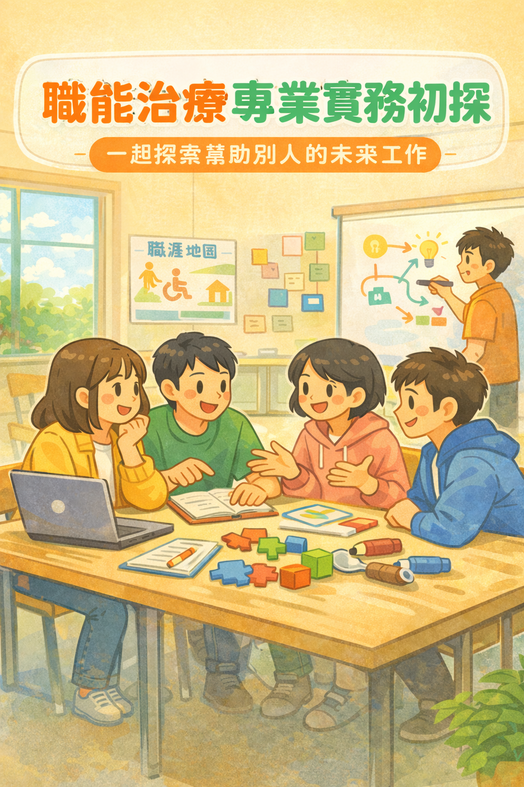 本系特色課程依專業養成脈絡規劃,前三年以校內授課為主,透過「職能治療專業實務初探」引導學生認識專業樣貌,結合實作小專題、系友分享與產業參訪,並結合「人工智慧在職能治療之應用」培養科技整合思維;第四年進入三站式臨床實習,強化評估、治療、紀錄與臨床推理,培育能獨立服務多元場域之職能治療人才。